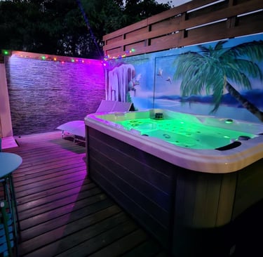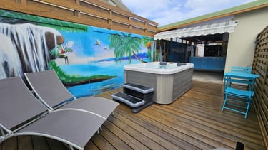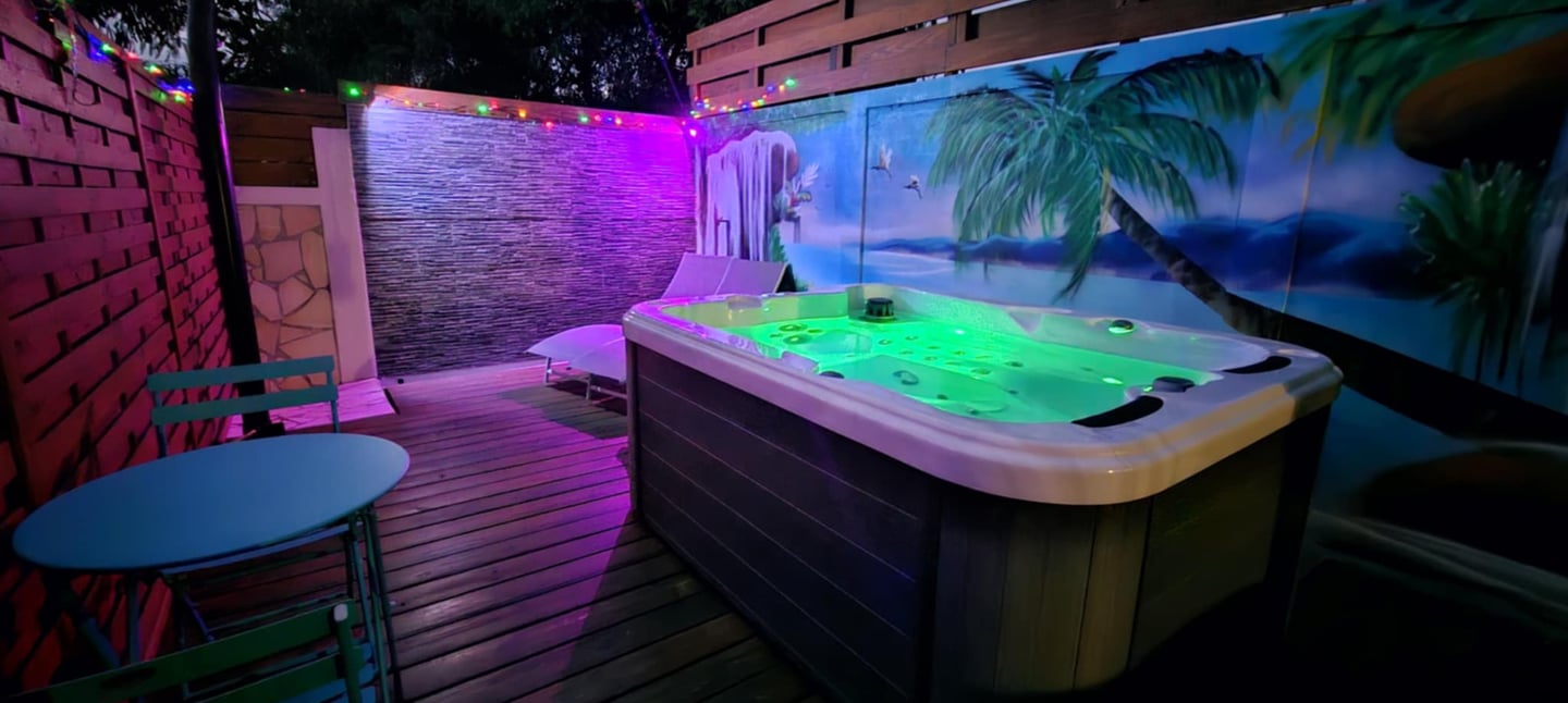 Jacuzzi privatif avec mur d’eau relaxant, parfait pour des soirées sous les étoiles.