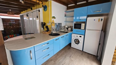 Cuisine semi-ouverte entièrement équipée : vaisselle, accessoires, électroménagers.